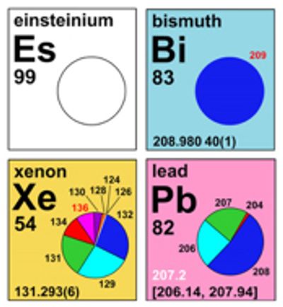Each cell of the Periodic Table of Elements and Isotopes provides the chemical name, symbol, atomic number, and standard atomic weight of an element. A pie chart displays the proportion of each isotope of the element.
